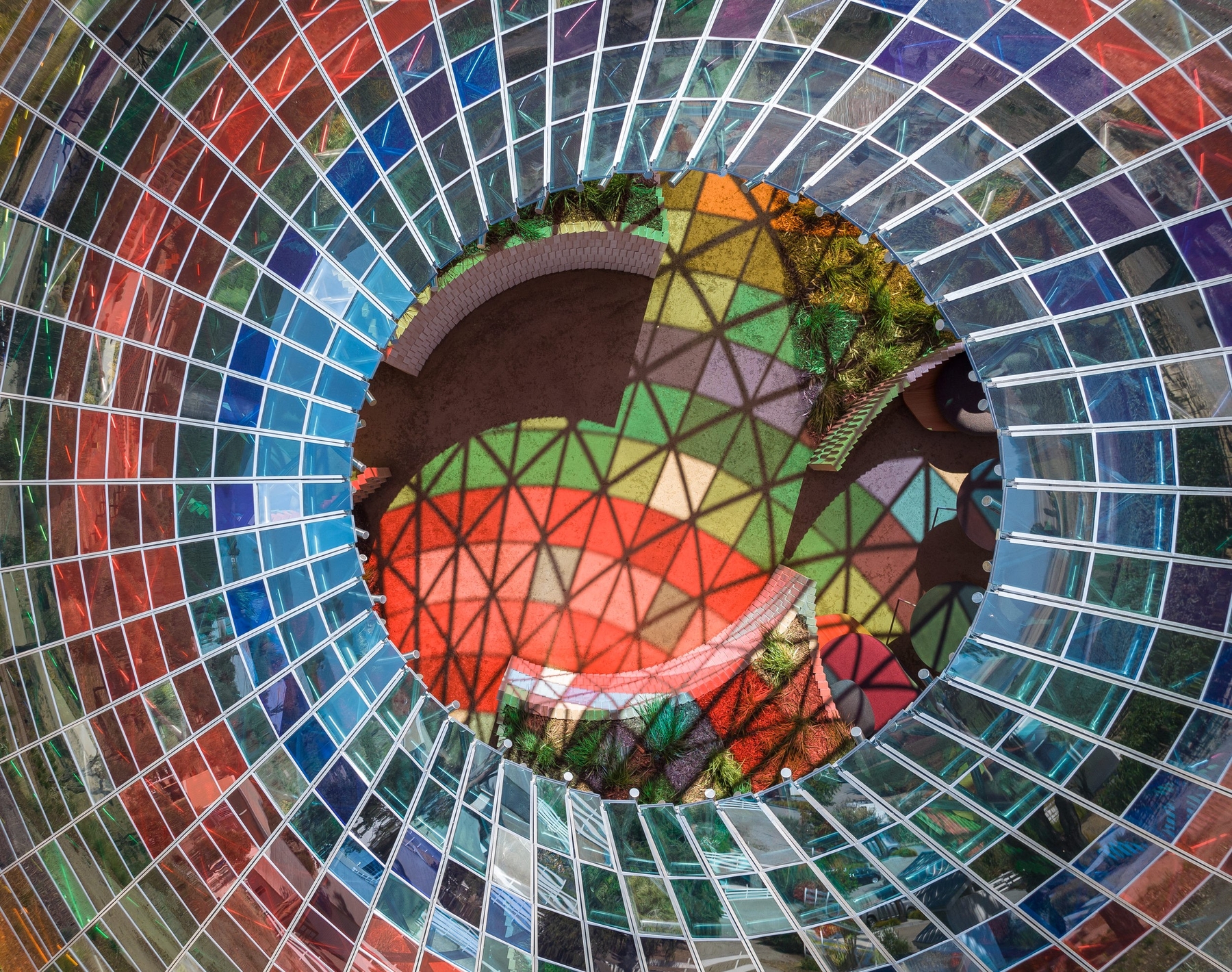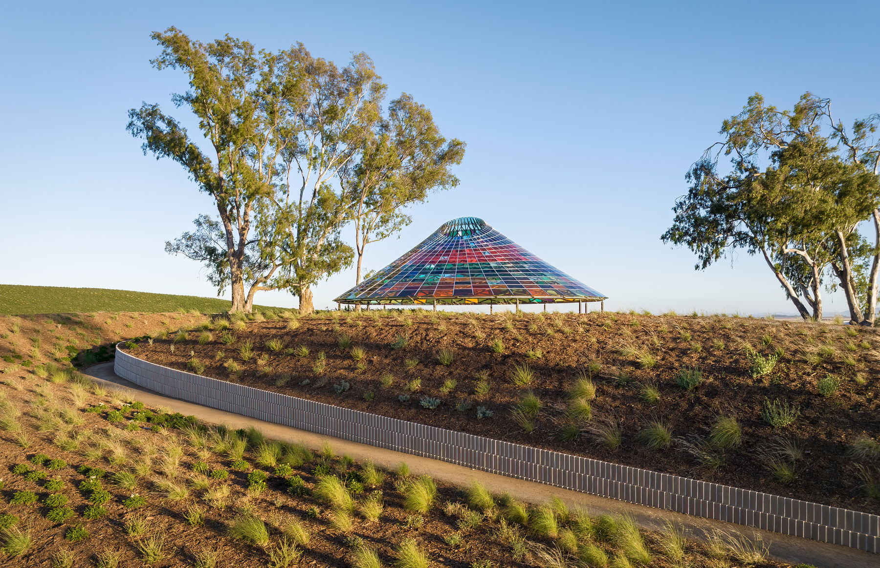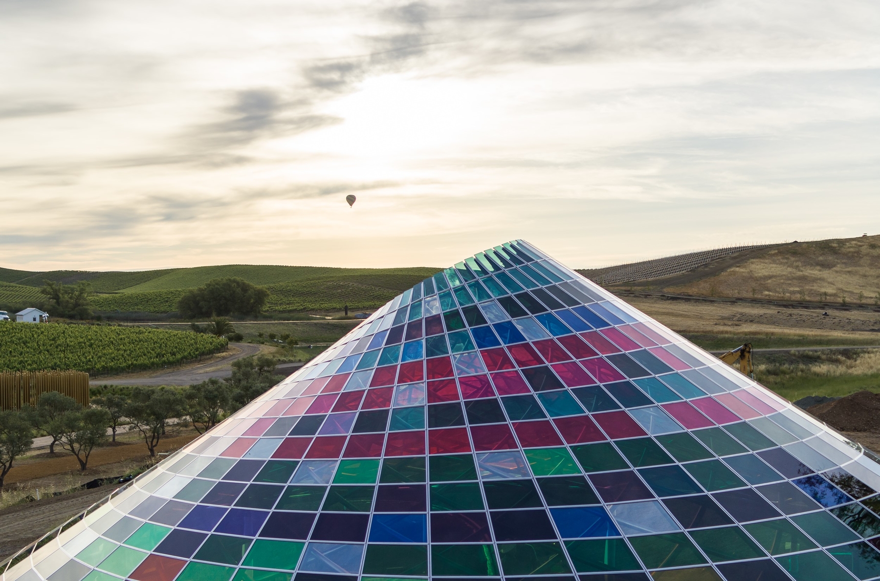 Vertical Panorama Pavilion is The Donum Estate’s newest bespoke architectural experience. Designed by Berlin-based firm Studio Other Spaces, founded by artist Olafur Eliasson and architect Sebastian Behmann, the conical canopy is composed of 832 multi-colored glass panels of varying hues and sizes. The new hospitality venue will offer a sensational experience for guests to enjoy the beauty of wine, nature, art and architecture in one holistic space.
