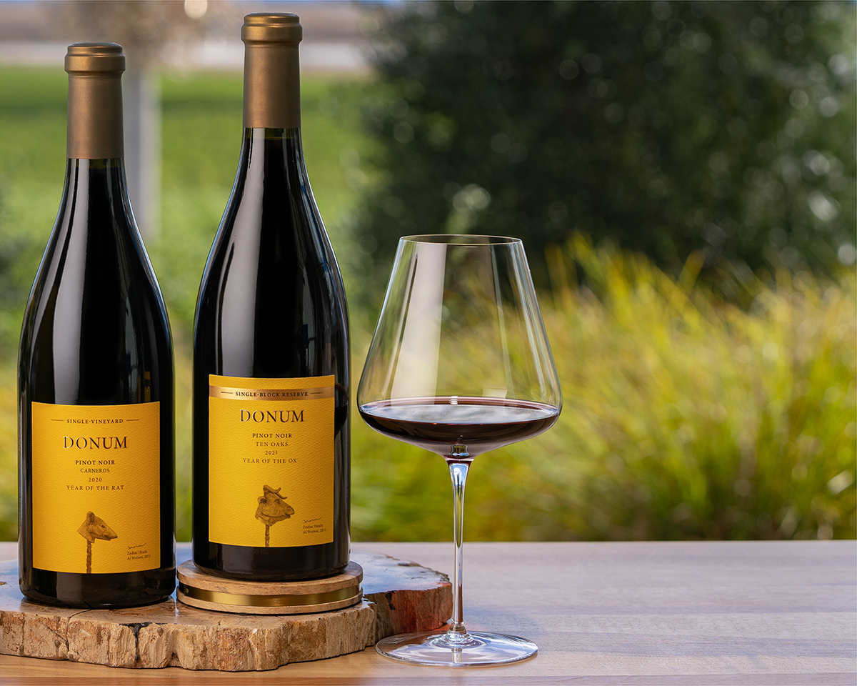an emphasis on power in the ripe 2018 vintage to an increasing emphasis on finesse. Throughout each vintage, the terroir signature of the Donum Estate—concentrated fruit with hints of sassafras and salinity—makes itself known. Additionally, we are featuring the 2021 Ten Oaks Pinot Noir, the lightest wine from our Russian River Valley vineyard. A part of the Donum portfolio for ten years now, the Ten Oaks was our first wine that put an emphasis on savory, earthy flavors over fruity.